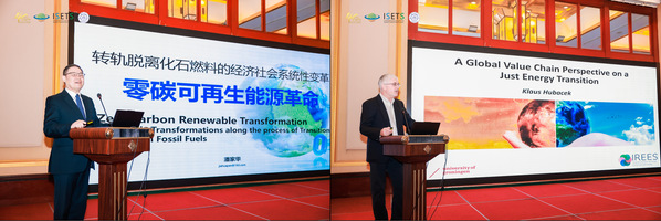 3日上午的大会主旨报告由男人天堂 副院长查冬兰主持,中国社会科学院学部委员潘家华和英国社会科学院院士、荷兰格罗宁根大学生态经济学家Klaus Hubacek就“全球追求碳中和:合作与创新”这一主题分别作报告。潘家华的报告“转轨脱离化石燃料的经济社会系统性变革——零碳可再生能源革命”阐述了风光可再生能源的发展困境以及潜在优势。Klaus Hubacek的报告“A Global Value Chain Perspective on a Just Energy Transition”探讨了国家内部和国家之间在能源转型上责任差异和能源转型中的公平性问题。