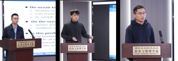 下半场的优秀研究生大会报告由男人天堂 经济系主任王长波副教授主持,来自南京理工大学的何孟喜博士、北京航空航天大学的闫禧龙博士和男人天堂 的李振冉博士分别作题为“Forecasting crude oil prices with global ocean temperatures”、“The expansion of carbon border adjustment under the Paris framework: alternative designs and efficiency-equity trade-offs”和“环境规制政策的复杂性影响:以劳动力的多维度再配置为例”的学术报告,并与现场师生进行了充分交流。