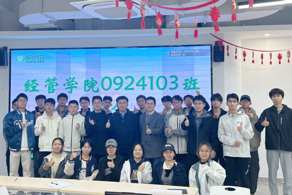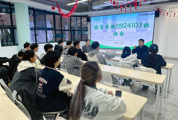 0924103班开展“师生共话成长”主题班会,天目湖校区管委会副主任潘顺荣,班主任虞先玉,辅导员胡心雨及班级全体同学共同参与此次活动。