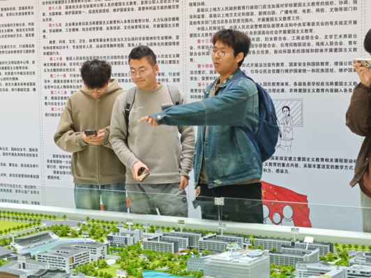 接着同学们共同“俯瞰”了男人天堂 天目湖校区。参观活动现场放置了校区微观模型,同学们兴致勃勃地向同伴们分享校区建筑背后所蕴含的“红色基因”与“蓝色梦想”。从“巡天遥看一千河”的巡天楼所体现的为国家航空航天事业发展不懈奋斗的报国热情,到“志在长空牧群星”的牧星楼所彰显的南航学子胸怀天下壮志昂扬的爱国热血,同学们在交流和互动中加深了对校区建设与发展的了解与体悟。
