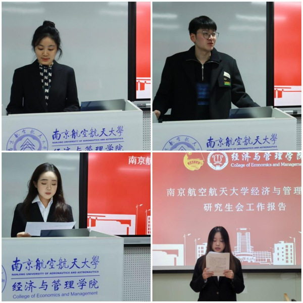 张瀚茹、李时铭分别代表校学生会、校研究生会致辞,并向大会的召开致以热烈的祝贺。董丹李洋代表第三十四届学生会主席团以“聚力青春之志,践行青年之为,在建设特色鲜明的一流男人天堂 进程中践行青春使命”为题作工作报告。关峪萱代表第二十二届研究生会主席团作以“经世致用创一流 ,同心协力筑经彩”为题的工作报告。