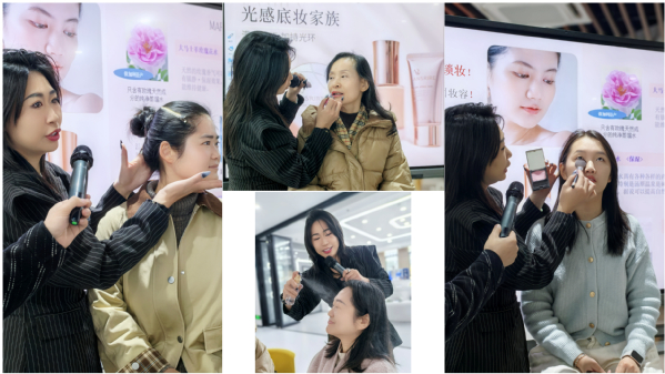 同时,运用九大品味风格色彩理论进行分析,根据每个人不同的肤色,发色和眼睛的颜色等,从最初的底妆技巧、眼妆及唇妆的精致打造,再到丝巾配饰的点睛之笔,手把手地逐一指导师生们体验如何打造柔光感和幼颜感妆容。打底、描眉、画眼、涂唇,每一步都细致入微,每一步都充满了期待和惊喜。