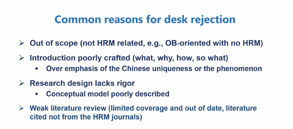 李应芳教授的讲座主要有以下内容:其一,李应芳系统阐述了人力资源管理(HRM)研究的发展脉络与研究趋势。具体而言,李应芳从企业导向、员工导向、社会导向和技术导向的四种视角出发,分别从人力资源管理研究的系统化、人本化、智能化以及对于员工需求满足的多样化、心理健康的重视化五条主线详细阐述了人力资源管理领域的发展路径、最新进展和未来趋势。此外,其特别强调,这五条主线并非相互割裂,而是相互联系、彼此交叉的。其二,李应芳从期刊主编、编辑、审稿人和研究学者的角度出发,分享了人力资源管理顶刊所关注的前沿主题、期刊投稿注意事项以及论文成功发表的重要要素等内容。首先,李应芳从研究内容、引言、文献综述、假设、方法、结论和贡献等方面提出了写作意见与建议;其次,李应芳以人力资源管理领域顶刊《Human Resource Management》为例,从写作格式、研究主题、标题设计等方面分享了投稿时的注意事项,同时也分享了被拒稿的潜在原因,这主要包括研究主题偏离期刊要求、研究设计缺乏严谨性、文献回顾内容片面且过时、假设支持力度弱等内容方面以及英文表述差、文章格式不规范等形式方面,这些均是在论文写作和投稿过程中需要重点关注的问题。其三,李应芳就如何向世界讲好中国人力资源管理故事、将中国情境下的人力资源管理研究推向世界提出了独特见解。首先,中国人力资源管理故事是世界人力资源管理故事中不可或缺的一部分,向全世界讲好中国故事必须要懂得“世界语言”;其次,研究者需要切实深入中国企业内部,使研究扎根于现实管理实践,做到“顶天”与“立地”。最后,关注因中西方文化背景和价值观不同导致的人力资源管理实践形式的差异。要立足中国情境讲好中国故事,需要自觉建构用于指导中国管理实践的本土化管理理论,而不应不加区分地套用西方的理论基础。