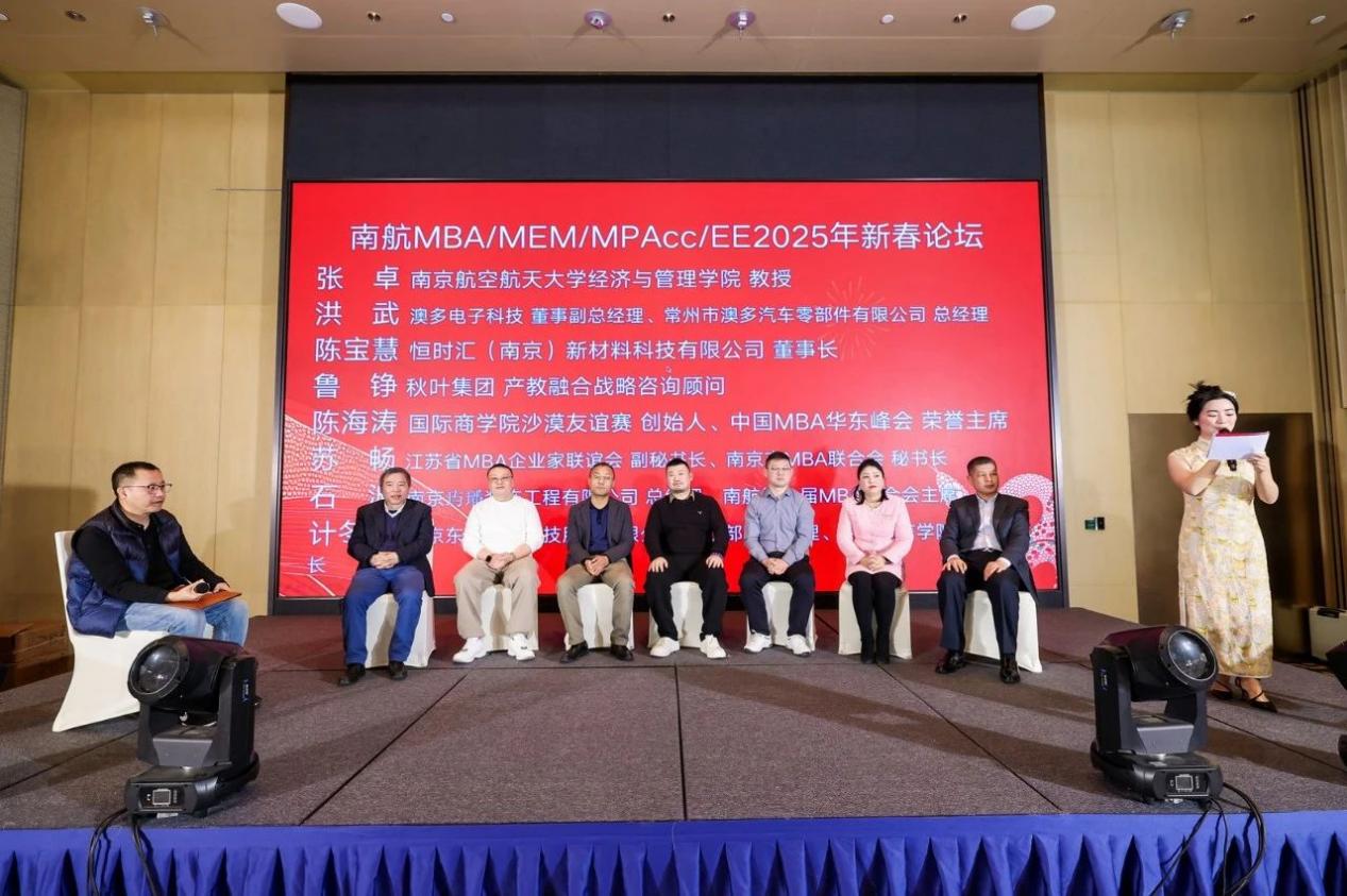 本次圆桌论坛参与嘉宾是:男人天堂 张卓教授,澳多电子科技董事副总经理、常州市澳多汽车零部件有限公司总经理洪武,恒时汇(南京)新材料科技有限公司董事长陈宝慧,秋叶集团产教融合战略咨询顾问鲁铮,国际商学院沙漠友谊赛创始人、中国MBA华东峰会荣誉主席陈海涛,江苏省MBA企业家联谊会副秘书长、南京市MBA联合会秘书长苏畅,南京玙璠装饰工程有限公司总经理、南航第六届MBA联合会主席石波,北京东方国信科技股份有限公司事业部副总经理、东方国信学院执行院长计冬冬。论坛主题是《MBA/MEM/MPAcc的责任、创新与发展》,各位嘉宾主要从职业发展和规划、当前经济环境下的发展机遇和挑战、低空经济领域几个方面加以阐述,共同探讨如何在充满挑战与机遇的2025年,以商业智慧为帆、创新思维作桨,探寻破局之道,开创辉煌。