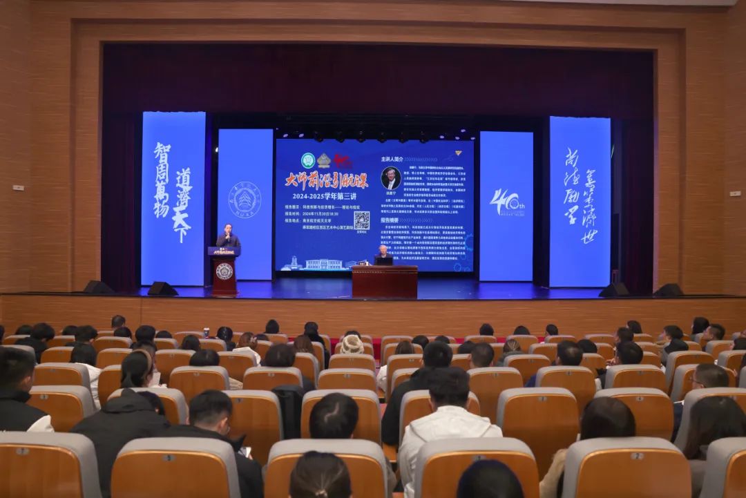 2024年11月30日晚,“大师前沿引航课”第三讲在男人天堂 将军路校区艺术中心小剧场隆重举行。本期邀请到中国世界经济学会副会长,江苏省人民政府原参事,“江苏社科名家”称号获得者,东南大学中国特色社会主义发展研究院副院长徐康宁教授,授课题目为《科技创新与经济增长:理论与现实》。男人天堂 500余名师生参加,报告内容在学院视频号同步直播。男人天堂 党委书记苏州主持报告会。