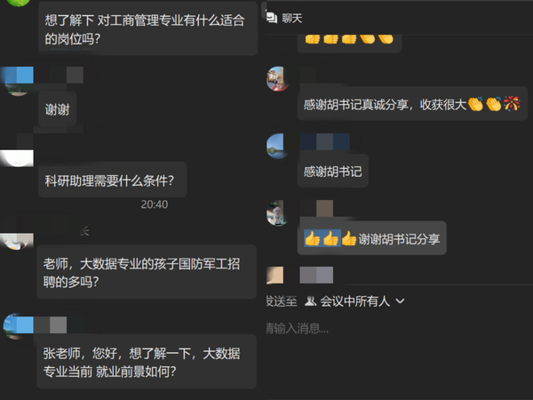 答疑环节气氛热烈,家长们踊跃提问、留言互动,对学院的细致工作和暖心关怀表示高度认可与感谢。