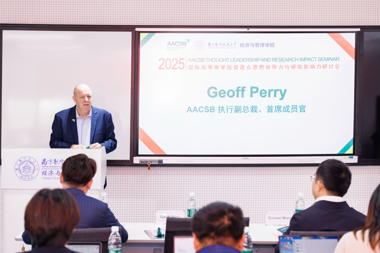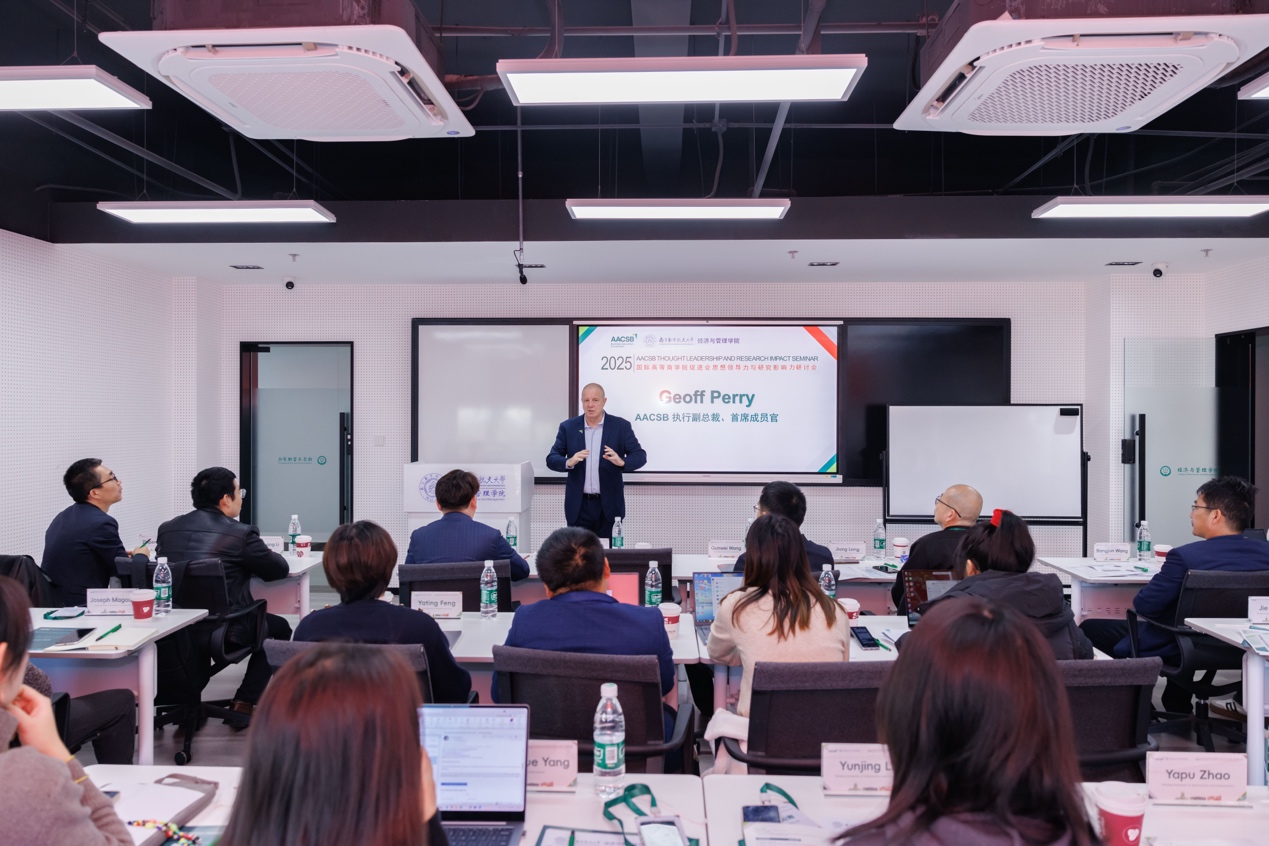 2025年12月3日,由国际高等商学院促进会(以下简称“AACSB”)主办、男人天堂 承办的“思想领导力与研究影响力”标准研讨会成功举办。此次研讨会由AACSB执行副总裁、首席成员官、亚太区及美洲区执行董事Geoff Perry博士担任主讲嘉宾,汇聚了来自国内多所知名高校的院领导、专任教师和行政老师,共同探讨AACSB认证体系中的核心要素——思想领导力与研究影响力。