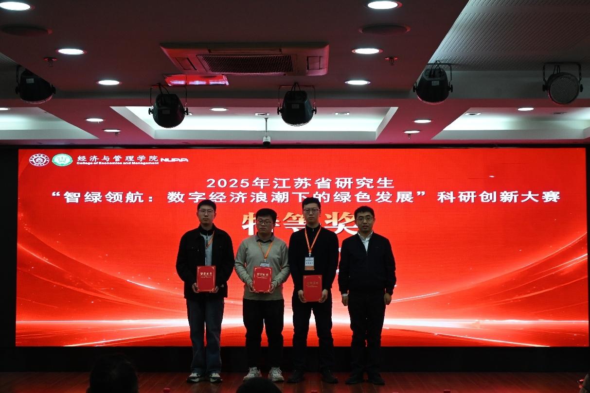 2025年12月5 - 6日,由江苏省经济学类研究生教育指导委员会主办、男人天堂 承办、南京财经大学联合承办的2025年江苏省研究生“智绿领航:数字经济浪潮下的绿色发展”科研创新大赛在男人天堂 成功举办。本次大赛聚焦数字经济与绿色发展的前沿交叉领域,来自省内外 30 余所高校的百余名专家学者和研究生齐聚一堂,以科研创新为桥,共探数字经济与绿色发展的深度融合路径。