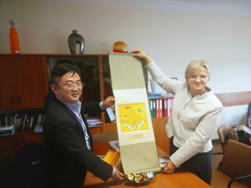 Professor Aida Macerinskiene warmly welcomes the Dean Zhou Dequn and his fellows, and introduces the history and the basic situation of Vilnius University to them. The faculty is made up of nine departments, including the business department, the department of economic information and so on, which train so many talents for the field of economics and management. Professor Macerinskiene expresses his strong willing to cooperate with our college in different ways.