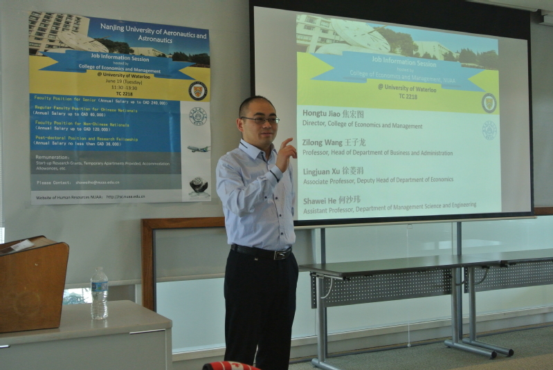 From June 18th to 21st, 2018, the delegation of the College of Economics and Management of Nanjing University of Aeronautics and Astronautics, Secretary Jiao Hong, Professor Wang Zilong, Associate Professor Xu Lingjuan, and Lecturer He Shawei, went to the University of Waterloo in Canada to hold an overseas talent recruitment meeting and visited Ryerson University in Toronto.