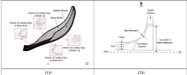 Fig. 2: (1) 3D meshes for the blades in the impeller; (2) The outer diameter and the tip clearance of the impeller