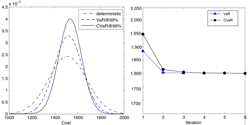 Figure 1. left: the probability distributions of optimal total cost in deterministic vs. stochastic models;      right: the changes in VaR/CVaR through the cutting plane algorithm.